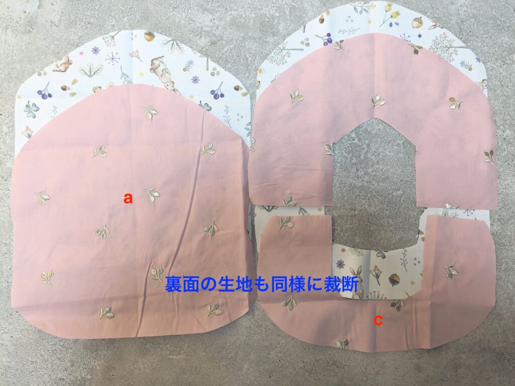 下からa表地→b, c表地→b, c裏地→a裏地の順番に重なった状態になります。