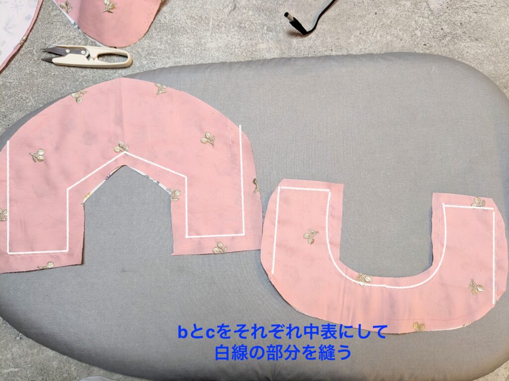 c も同様に中表にして合わせ、一番下の弧以外を縫います。