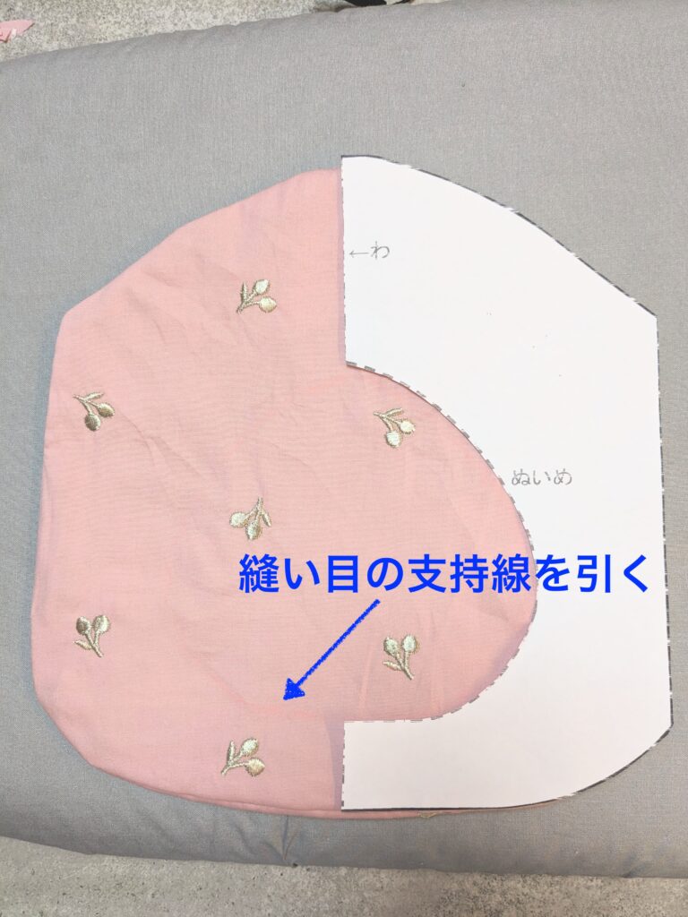 生地を折って”わ”をつくり、型紙に沿って支持線を引きます。