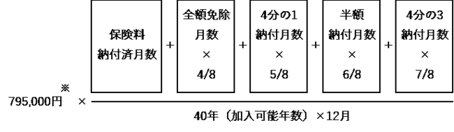 老齢基礎年金は、受給資格期間が10年以上ある場合に、保険料納付済期間に基づいて計算される額(以下の式参照)を65歳から受け取ることができます。 (参考:日本年金機構 – 老齢基礎年金の受給要件・支給開始時期・年金額)